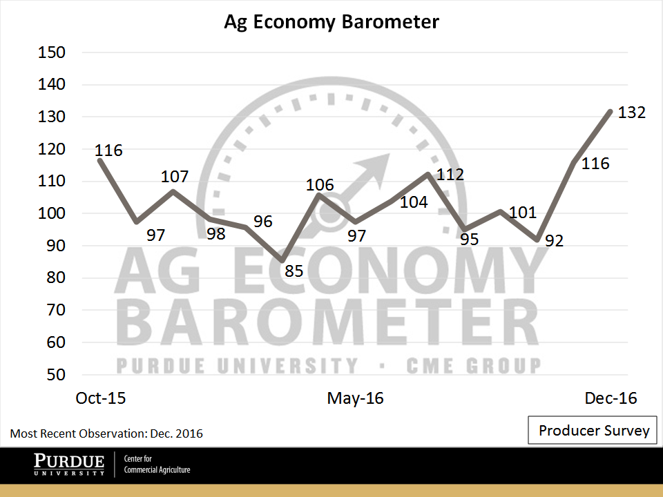 Agricultural producer sentiment rose sharply as 2016 drew to a close. December’s reading of 132 for the Purdue/CME Group Ag Economy Barometer marked the second month in a row that the index increased, rising to its highest level since data collection began in October 2015. The December reading is 16 points above November’s and 40 points higher than in October (Figure 1). The barometer is based on a monthly survey of 400 agricultural producers from across the country.