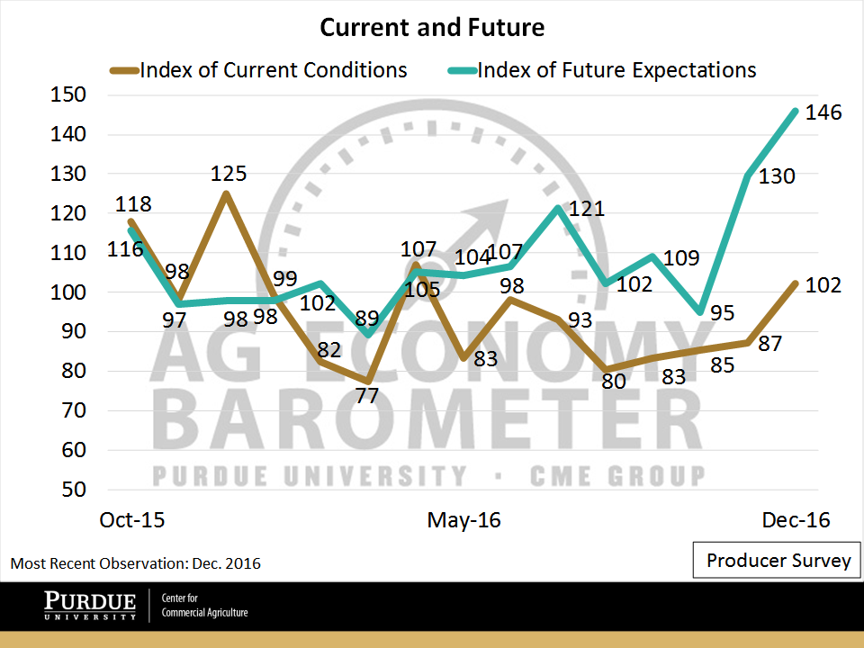 Producer sentiments took a post-election jump in the month of December. The Purdue University/CME Group Ag Economy Barometer December reading of 132 marked the second straight monthly increase. That’s also the highest level since the survey began in October of 2015. The December mark was 16 points above the November mark and 40 points higher than October. Producers seemed optimistic about both current and future conditions in the December survey, but the biggest improvement was in producers’ expectations about future economic conditions. The index of Future Expectations jumped to an impressive 146 total, up 51 points over October and the highest number since data collection began. The improved expectations are for outside of agriculture as well. The October sentiment before the elections and the December expectations after the elections were drastically different. Only 13 percent of October respondents expected the overall economy to improve, but 50% of the December respondents expect the economy to expand. In October, 35 percent of respondents expected good times ahead for U.S. economy over the next five years. In December, that number jumped to 71 percent.