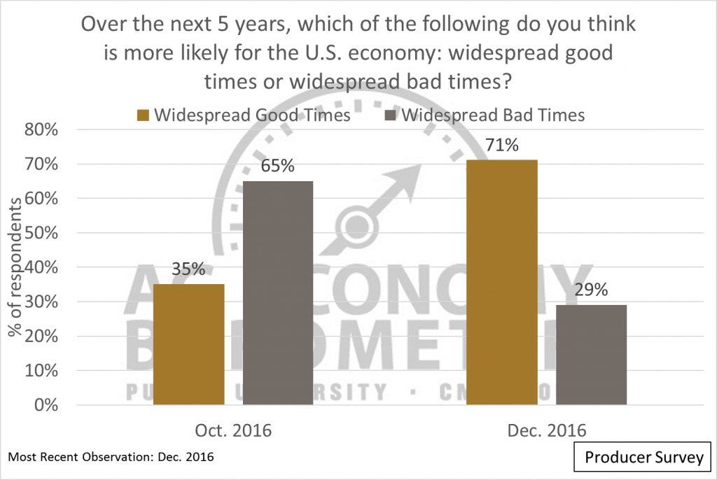 The improvement in sentiment regarding the U.S. economy was not limited to just the next 12 months. When asked about their perspective regarding the U.S. economy over the next five years, the change in sentiment from October to December was equally dramatic. In October, 35 percent of respondents indicated they expect “widespread good times” for the U.S. economy over the next five years (Figure 4). In December, the share of respondents expecting widespread good times more than doubled to 71 percent. The improvement in optimism regarding the U.S. economy among agricultural producers appears to parallel that of U.S consumers. For instance, the University of Michigan’s Index of Consumer Sentiment rose from a reading of 87 in October to a 12-year high of 98 in December.