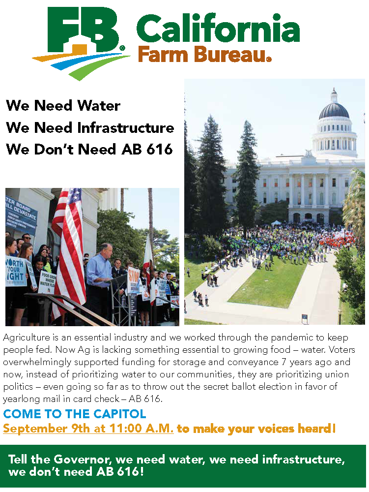 Farm Bureau is encouraging folks to gather at 11 am, on Thursday, Sept. 9th at the California State Capitol. Contact your local Farm Bureau office for more information.