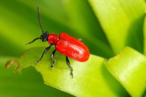 Images: (top right) The scarlet lily beetle (Lilioceris lilii). Beetles leave considerable damage on host plants. Damage to the leaves and flowers can also leave the plants weakened and susceptible to diseases.