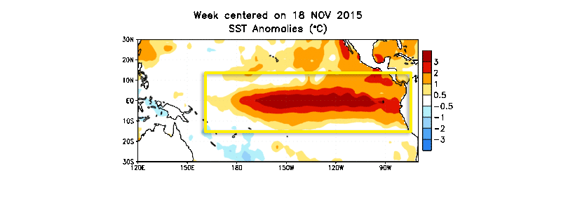 This animation shows the evolution of water temperatures compared to average in the equatorial Pacific Ocean from mid-November 2015 through early February 2016. Darker orange and red shadings represent where water temperatures are the farthest above average. (CPC/NOAA)