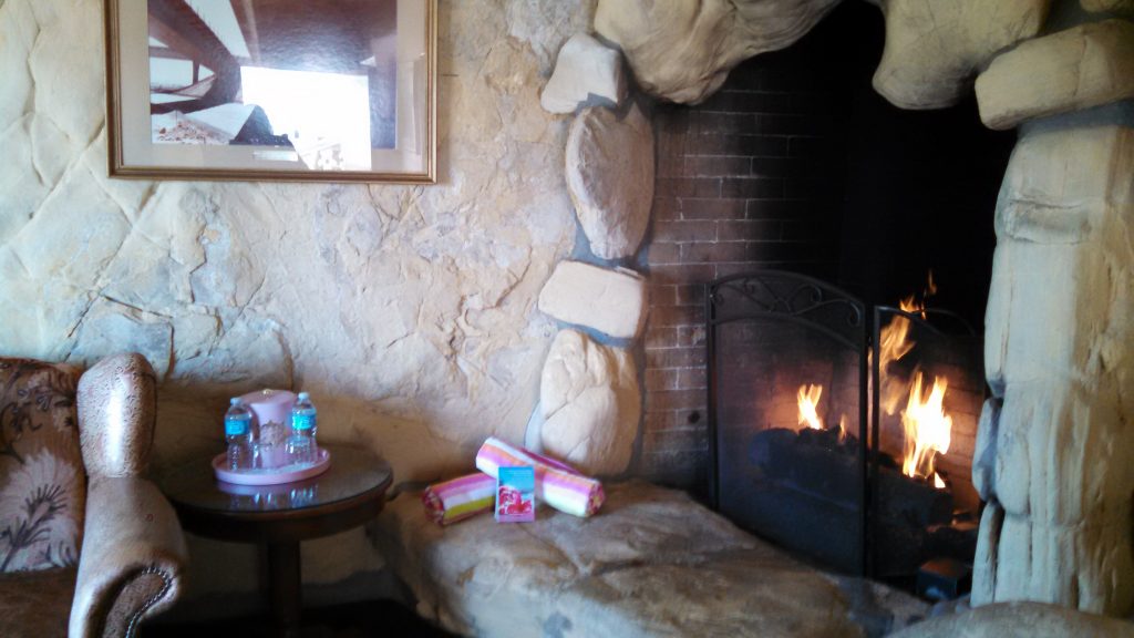 - Fireplace inside one of the Madonna Inn rooms
