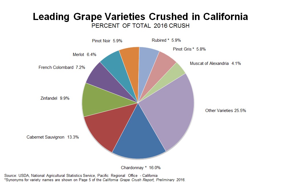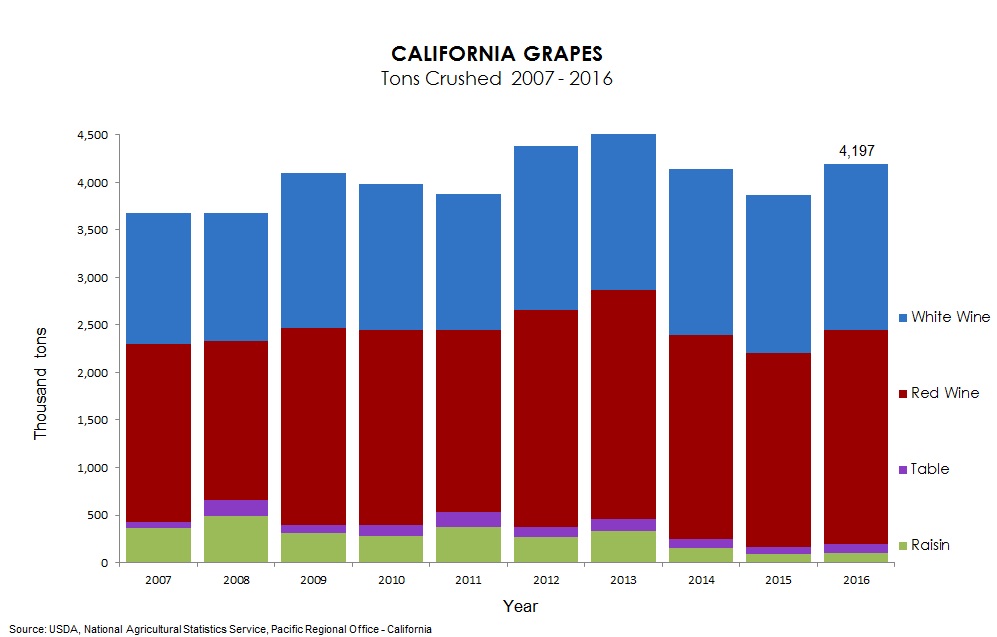 The 2016 crush totaled 4,196,723 tons, up 8.5 percent from the 2015 crush of 3,868,459 tons. Red wine varieties accounted for the largest share of all grapes crushed, at 2,255,300 tons, up 10.5 percent from 2015. The 2016 white wine variety crush totaled 1,745,490 tons, up 4.9 percent from 2015. Tons crushed of raisin type varieties totaled 98,205, up 6.2 percent from 2015, and tons crushed of table type varieties totaled 97,729, up 38.3 percent from 2015.