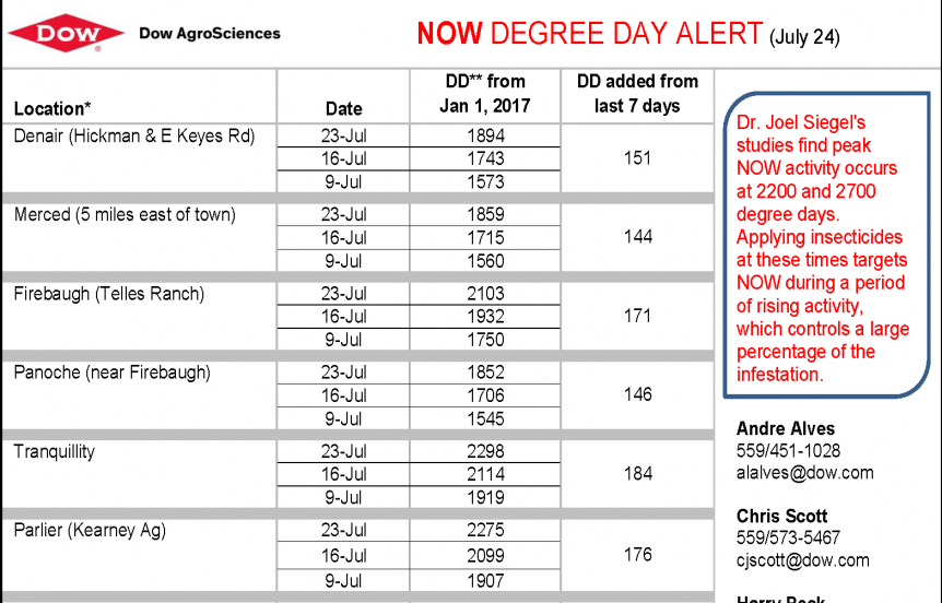 Dow AgroSciences and Intrepid Edge insecticide bring us the Navel Orangeworm (NOW) Degree Day Report for pistachios as of July 24. Degree days are determined using the calculator at the …