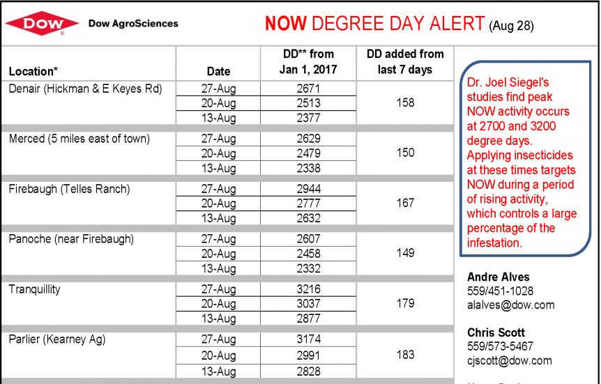 Dow AgroSciences and Intrepid Edge insecticide bring us the Navel Orangeworm (NOW) Degree Day Report for pistachios as of August 28. Degree days are determined using the calculator at the …
