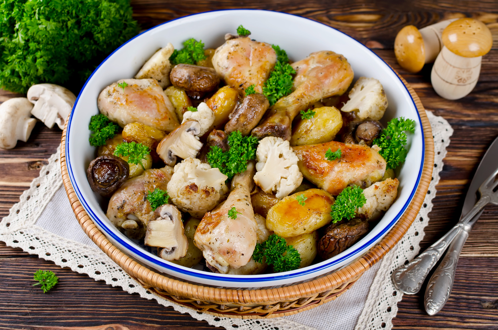- Baked chicken drumsticks with potatoes, mushrooms and cauliflower served Rustic style