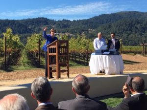 - CDFA Secretary Karen Ross speaking at the EGVM eradication event at Robert Mondavi Winery. To her left are Keith Horn with Constellation Wines US and USDA Deputy Under Secretary Elvis Cordova.