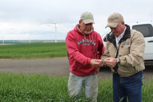 Skip Mead (left) and Administrator Dolcini (right) check the wheat quality of a field in Columbia County, Washington.