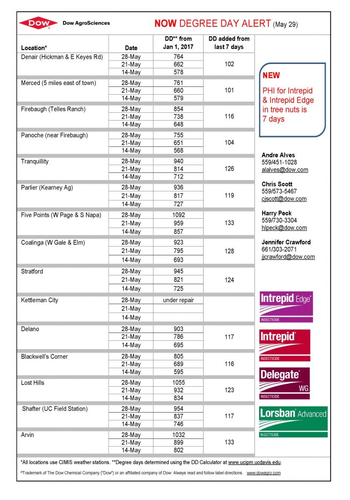 Dow AgroSciences and Intrepid Edge insecticide bring us the Navel Orangeworm (NOW) Degree Day Report for pistachios as of May 29. Degree days are determined using the calculator at the University of California integrated pest management website. All locations use CIMIS weather stations.