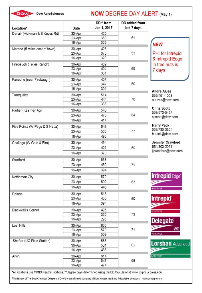 Dow AgroSciences and Intrepid Edge insecticide bring us the Navel Orangeworm (NOW) Degree Day Report for pistachios as of May 1. Degree days are determined using the calculator at the University of California integrated pest management website. All locations use CIMIS weather stations
