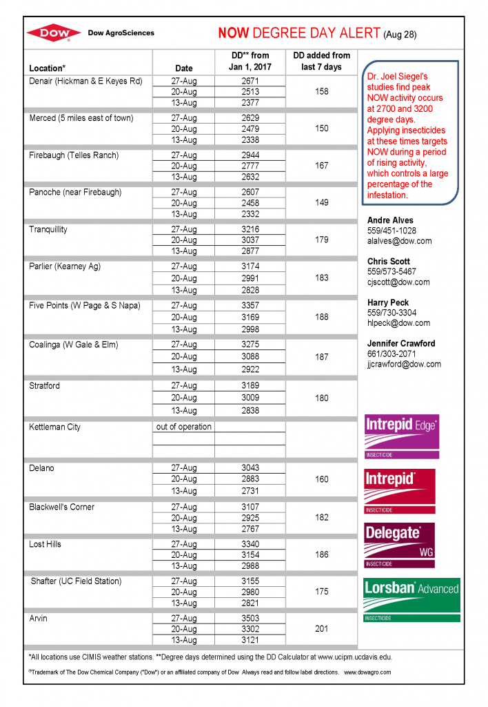 Dow AgroSciences and Intrepid Edge insecticide bring us the Navel Orangeworm (NOW) Degree Day Report for pistachios as of August 28. Degree days are determined using the calculator at the University of California integrated pest management website. All locations use CIMIS weather stations.
