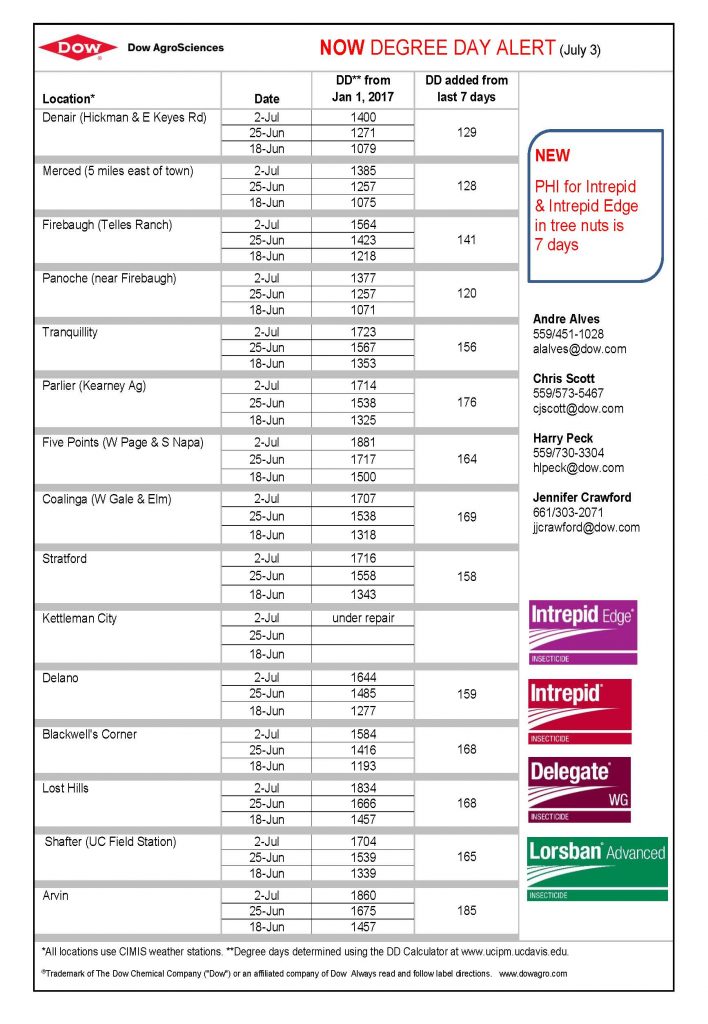 Dow AgroSciences and Intrepid Edge insecticide bring us the Navel Orangeworm (NOW) Degree Day Report for pistachios as of July 3. Degree days are determined using the calculator at the University of California integrated pest management website. All locations use CIMIS weather stations.