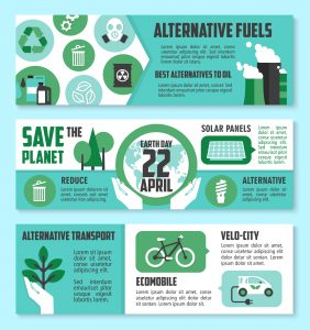 Image: (bottom right) Earth Day, ecology banner set. Green energy, eco transport and alternative fuel poster with tree, recycle, solar panel, biofuel, bicycle, electric car and globe icons. Save the planet themes design.