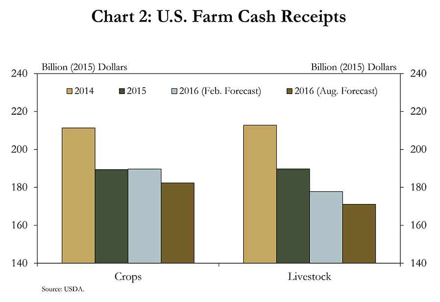 In August, expectations for 2016 farm income were revised up modestly from the February forecast, but income was still expected to decline notably from a year ago. The U.S. Department of Agriculture’s August revision can be interpreted as both positive and negative for the farm sector. On the positive side, farm income expectations for 2015 and 2016 were revised up by 43 percent and 31 percent, respectively (Chart 1). On the negative side, however, the expected decline in farm income from 2015 to 2016 widened from 3 percent earlier in the year to 11 percent in the most recent report. Essentially, farm income was higher than initially forecasted, but the deterioration from a year ago is now believed to be sharper than expected.