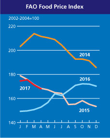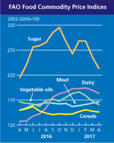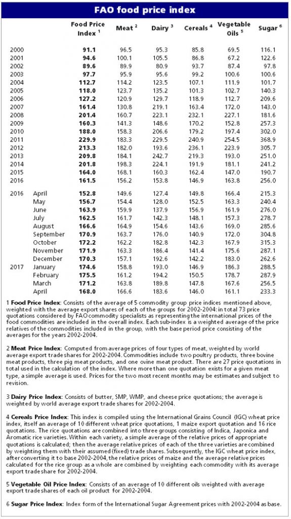 » The FAO Food Price Index* (FFPI) averaged 168.0 points in April 2017, down 3.1 points (1.8 percent) from March, but still 15.2 points (10 percent) higher than in April 2016. As in March, all commodity indices used in the calculation of the FFPI subsided in April, with the exception of meat values.