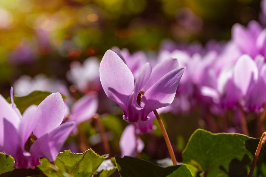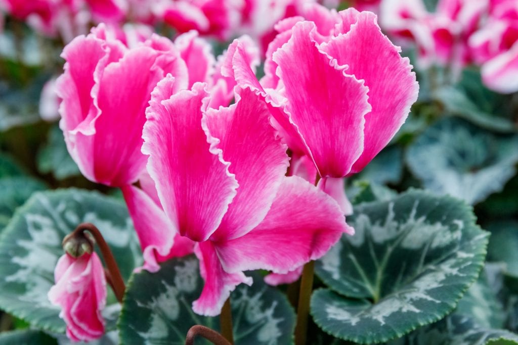 Popular in coastal flower beds, Cyclamen blooms are stunning all winter season long. The flowers inch open slowly, but the foliage is colorful and interesting to view. You’ll see them in grocery stores each winter in shades of white, purple, pink, and red.
