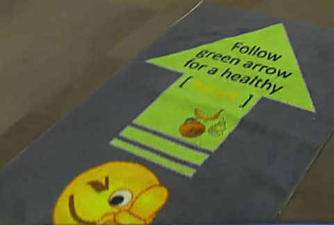 Payne and Niculescu also designed 6-foot-by-3-foot green arrow floor stickers to point shoppers toward the produce aisle, with messages like “Follow the green arrow for your health.”