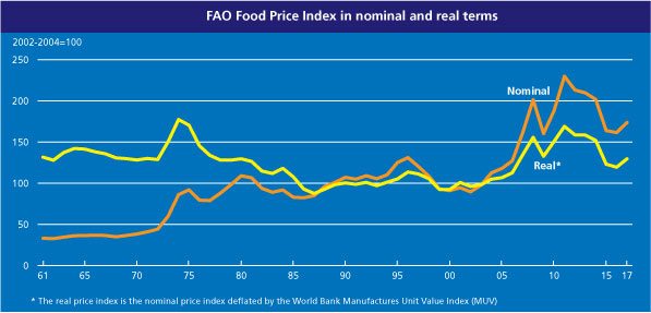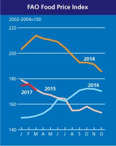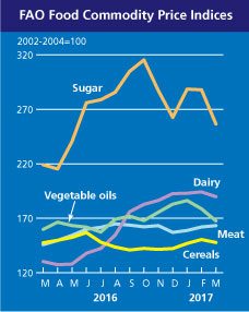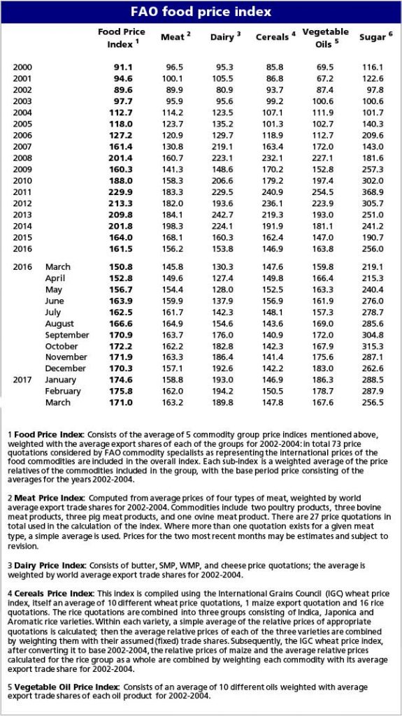 » The FAO Food Price Index* (FFPI) averaged nearly 171 points in March 2017, down almost 5 points (2.8 percent) from February, but still 20 points (13.4 percent) above its level a year earlier. With the exception of meat, the indices of all other commodities used in the calculation of the FFPI dropped in March, especially those of sugar and vegetable oils.