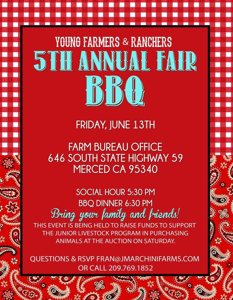 The barbeque is Friday, June 13, 2014 starting at 5:30 P.M. at the Merced County Farm Bureau office. There is no charge to attend, however there will be opportunities to buy raffle tickets to support the fundraiser. Money raised at the event goes toward purchases at the following day’s junior livestock auction.