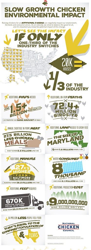 - Additional manure output: Slower growing chickens will also stay on the farm longer, producing 28.5 billion additional pounds of manure annually. That’s enough litter to create a pile on a football field that is 27 times higher than a typical NFL stadium.