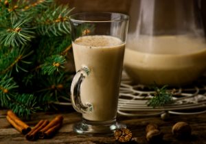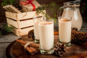 Eggnog, also known as egg milk punch, is a very popular drink this time of year. The sweetened dairy-based beverage that is traditionally made with milk and/or cream, sugar, whipped eggs and spices. When served at parties and holiday get-together’s, liquor is often added to the eggnog such as brandy, rum, whisky,