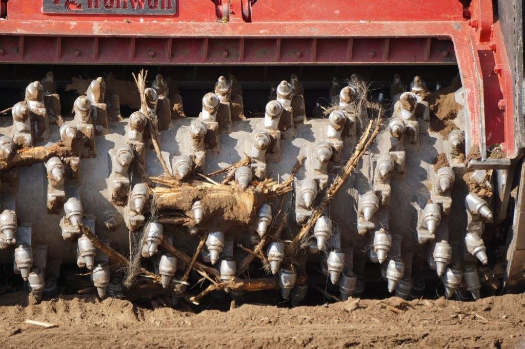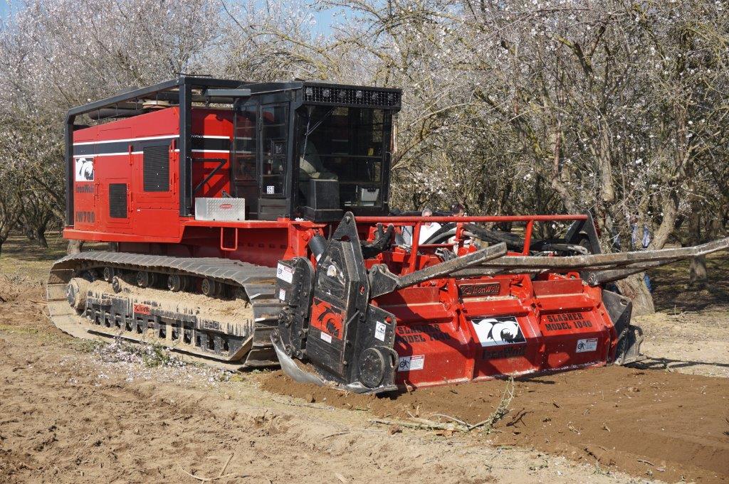 Using an “Iron Wolf,” a 50-ton rototiller capable of grinding whole trees and incorporating chips into the soil, whole peach trees in an old orchard were shredded and incorporated in plots, with trees in other plots burned and the ashes spread on the soil surface. Almond trees planted in both plots were fertilized normally.