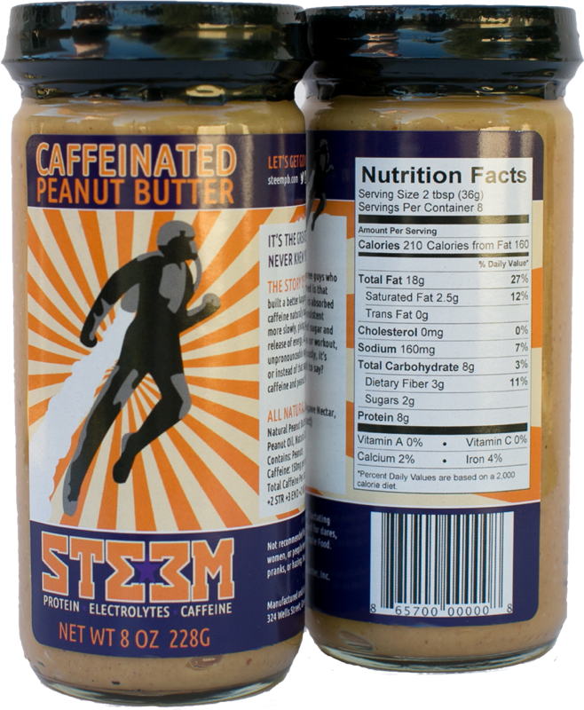 STEEM is a caffeinated peanut butter being sold in retail stores and online. Its makers say that STEEM is made with natural peanut butter and contains no artificial sweeteners.