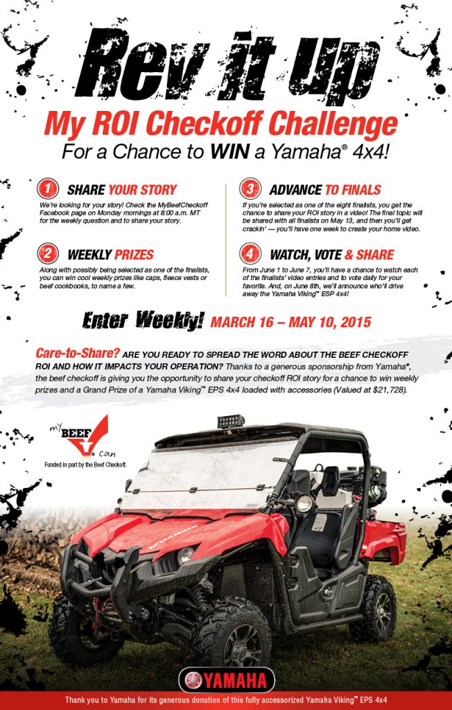 The Beef Checkoff Program has a unique opportunity to encourage checkoff investors to share how they personally benefit from checkoff efforts, thanks to a generous donation from Yamaha of a 3-passenger VikingTM EPS 4×4 with specialized accessories valued at $21,728.07.