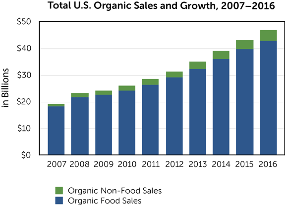 Organic food sales increased by 8.4 percent, or $3.3 billion, from the previous year, blowing past the stagnant 0.6 percent growth rate in the overall food market. Sales of organic non-food products were up 8.8% in 2016, also handily surpassing the overall non-food growth rate of 0.8 percent.
