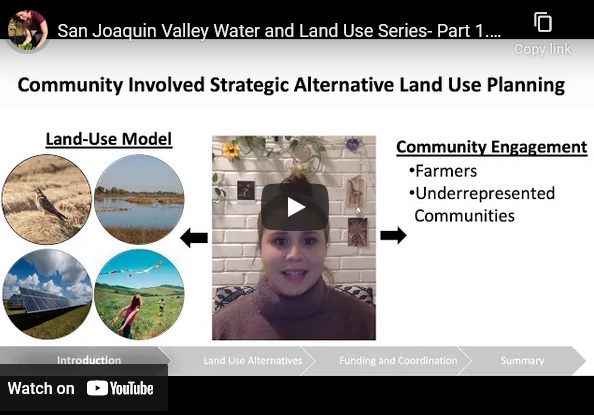 …the YouTube channel CaliWaterAg. The latest installment, Part 1.4, addresses land repurposing related to SGMA. Ph.D. Candidate at UC Merced, Vicky Espinoza develops the content and manages the channel. “It…
