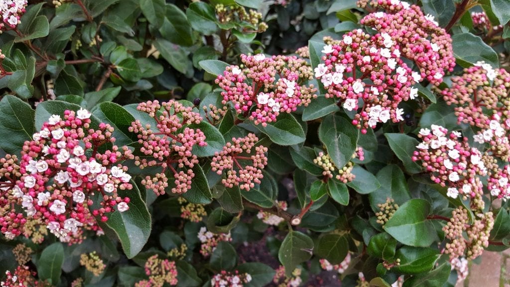 One example is Viburnum. There are dozens of viburnum species and varieties to choose from, but most bloom in shades of pink and white, and many offer a pleasant fragrance or great fall foliage color. Some varieties of viburnum, like ‘Eastern Snowball,’ can even look like hydrangeas when they’re in bloom.