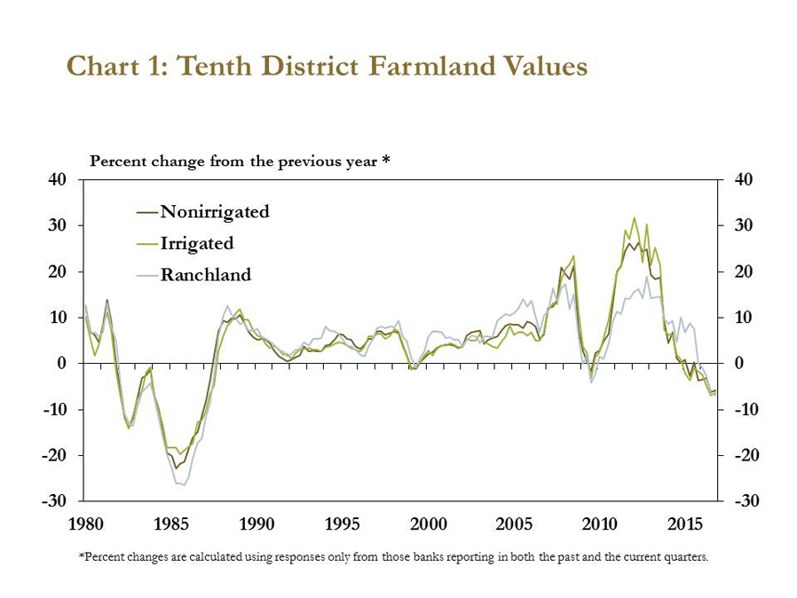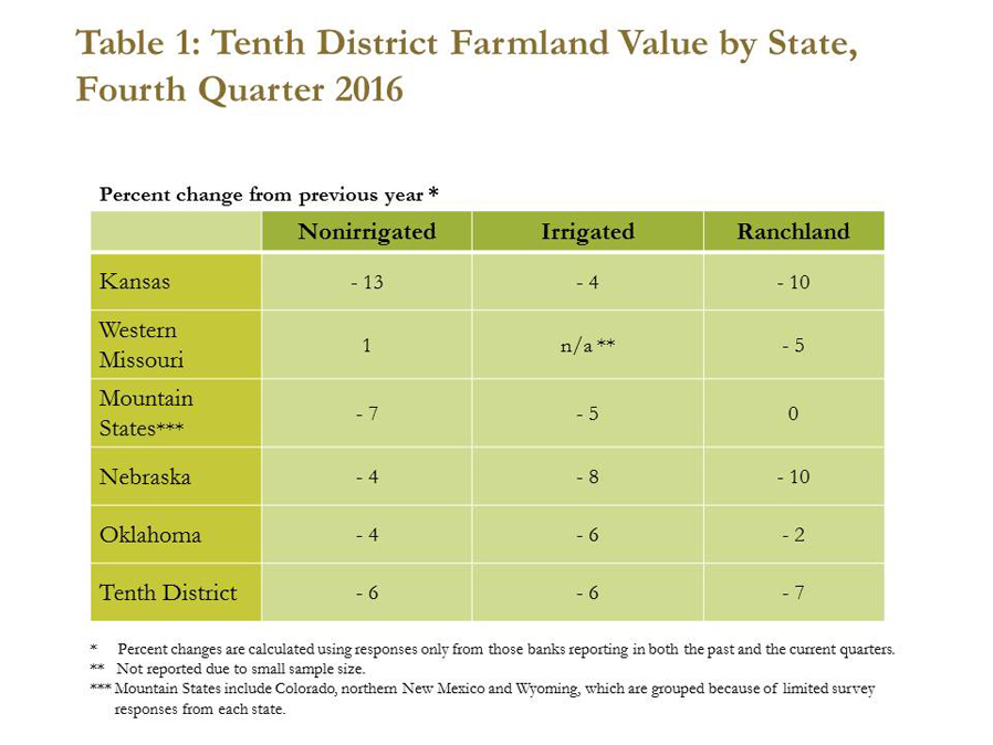 FOURTH QUARTER 2016 Farmland values and cash rents declined moderately in the fourth quarter of 2016. Bankers across the Tenth District noted that persistent weakness in farm income continued to weigh on farmland values. Although most farmland purchases in the quarter were financed with new debt, the portion of new loans with a cash down payment decreased. The persistent and widespread deterioration in farm income has occurred alongside increasing loan demand and lower repayment rates. These trends are expected to continue in the first quarter of 2017.