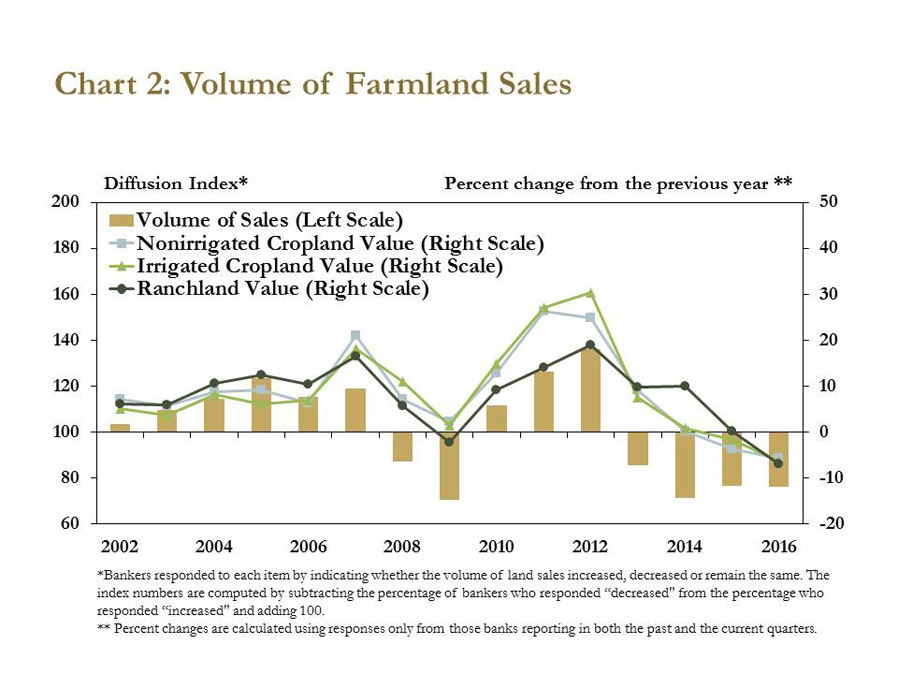 Farmland values fell alongside moderate declines in the volume of farmland sales. A majority of bankers reported that fourth-quarter farmland sales were lower than a year ago, following a similar trend that has occurred since 2013 (Chart 2).