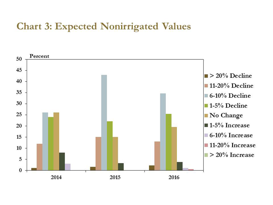 Moreover, bankers expected the downward trend in farmland values to continue. Seventy-five percent of bankers responding to the survey indicated they expect the value of nonirrigated farmland to decrease further in 2017, while only 5 percent expected an increase in nonirrigated farmland values (Chart 3). More specifically, a majority of bankers expected a decline of 6 percent to 10 percent in nonirrigated farmland values by year-end 2017.