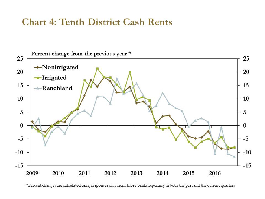 Amid the slump in farmland values, cash rents also edged down. Cash rents for nonirrigated and irrigated cropland each fell 8 percent while ranchland cash rents fell 12 percent from the fourth quarter of 2015 (Chart 4). In fact, cash rents for each type of farmland were down from 2015 in each quarter of 2016. All District bankers surveyed in the fourth quarter expected cash rents to remain unchanged or decline in the first quarter of 2017.