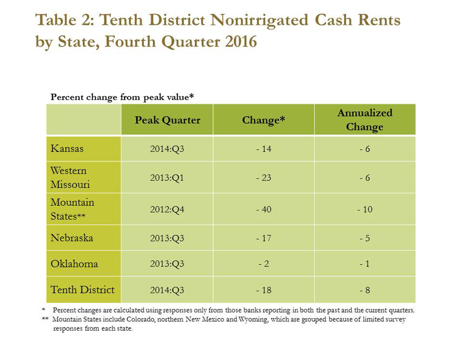 After falling steadily for several quarters, cash rents in the fourth quarter were down sharply from their peak values. In the Mountain States, for example, cash rents on non-irrigated cropland have fallen 40 percent from their peak in the fourth quarter of 2012 to the fourth quarter of 2016 (Table 2). In Oklahoma, cash rents on non-irrigated cropland have decreased 2 percent from peak values. Although total declines from peak values vary by state, annualized changes are more similar. For producers, a reduction in cash rents could help alleviate some pressure on profit margins because cash rents account for a large share of production expenses.i