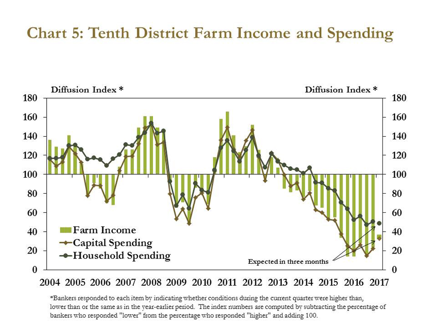 Farm income also weakened in the fourth quarter. In fact, farm income fell for the fifteenth consecutive quarter, the longest such streak in survey history (Chart 5). Moreover, 70 percent of bankers expected the downward trend to continue in the first quarter of 2017. Capital and household spending extended declines to 15 and 10 consecutive quarters, respectively. Although the pace of decline lessened somewhat for all three measures, the persistent nature of the downturn continued.
