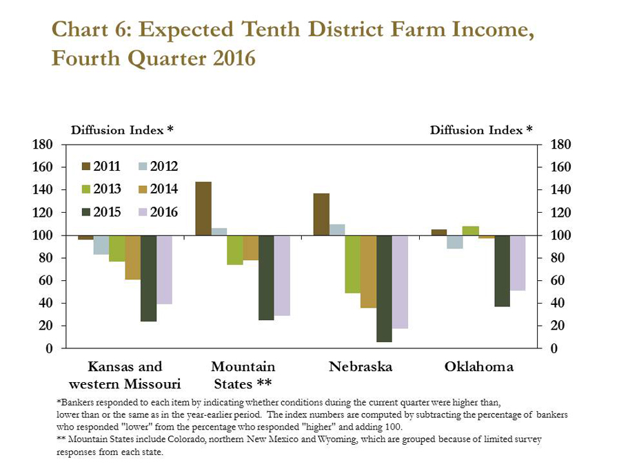 Persistently lower farm income has been felt across the Tenth District. Bankers in each District state have, on average, logged at least six consecutive quarters of declining farm income. Furthermore, at least 50 percent of bankers in each state indicated they expect farm income to decline in the first quarter of 2017 (Chart 6).