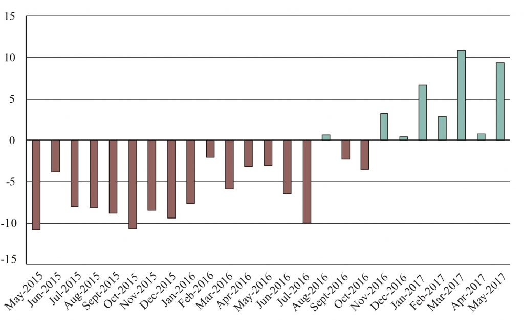 The 9.4 percent rise from May 2016 is the seventh consecutive month in which the year-over-year value in current dollars of U.S.-NAFTA freight increased from the same month of the previous year (Figure 1).