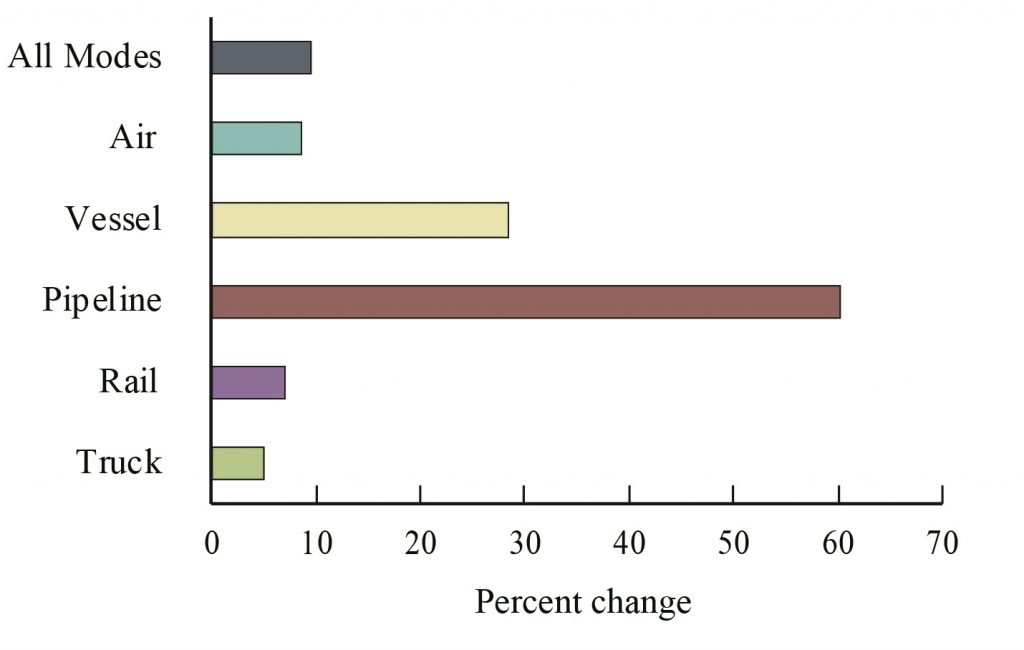 The value of commodities moving by pipeline increased 60.3 percent, vessel by 28.4 percent, air by 8.7 percent, rail by 7.0 percent, and truck by 5.0 percent (Figure 2, Table 2). In contrast with recent months, there was only a modest year-over-year increase in the price of mineral fuels (3.8 percent). In May, the increase in the value of freight by pipeline and vessel more closely reflected a greater volume of mineral fuels moved rather than an increase in the price of those commodities.