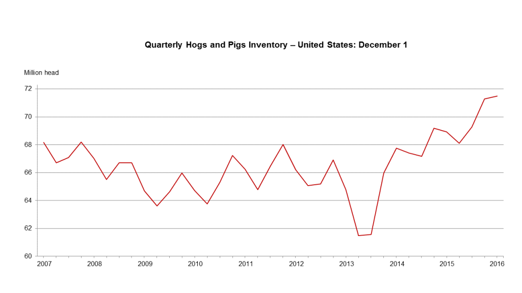 As of December 1, there were 71.5 million hogs and pigs on U.S. farms, up 4 percent from December 2015, and up slightly from September 1, 2016, according to the Quarterly Hogs and Pigs report published by the U.S. Department of Agriculture’s National Agricultural Statistics Service (NASS).