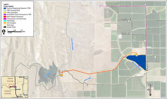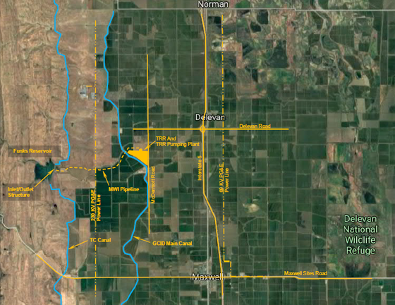 The MWI includes the construction of 3 ½ miles of 12-foot diameter pipeline along with a new pump station that will be used to pump water from the GCID system to the existing Tehama-Colusa Canal Authority’s (TCCA) Funks Reservoir. Exchanges of water from Funks Reservoir to the GCID system will occur through the new pipeline by gravity flow in the reverse direction. The project also includes the construction of a new 1,200 acre-foot Terminal Regulating Reservoir (TRR) to be constructed adjacent to the GCID Main Canal that will help to regulate flows in the GCID main canal and support the operation of the Maxwell Water Intertie facilities. You may click on the images below to view larger maps online.