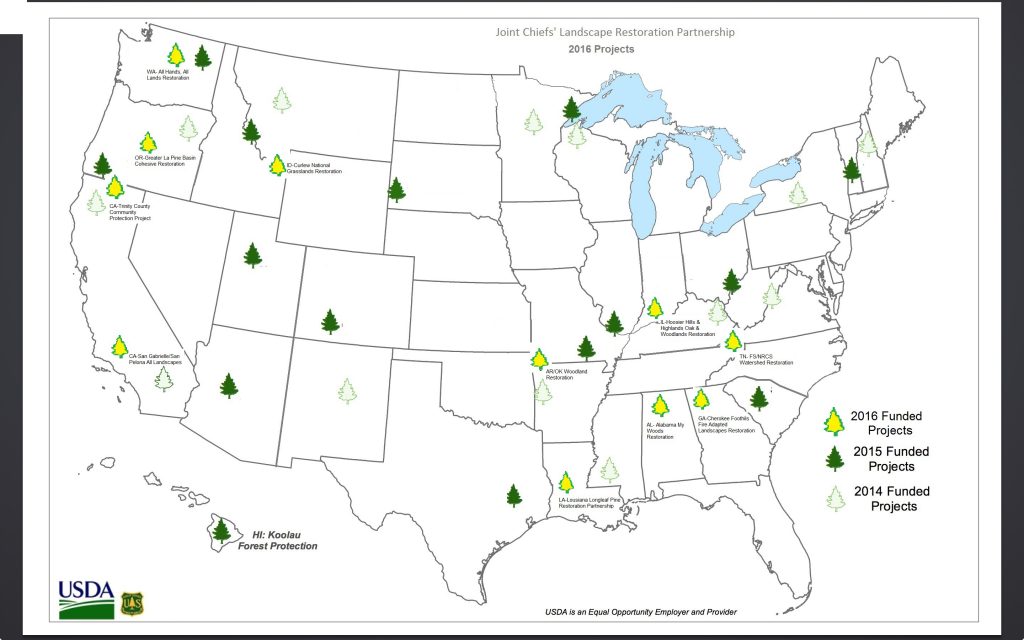 Since its start, $104 million has been invested through USDA’s Joint Chiefs’ Landscape Restoration Partnership to reduce wildfire threats to communities and landowners, protect water resources, and improve habitat for at risk species. Summaries of all projects selected can be found on the NRCS website.