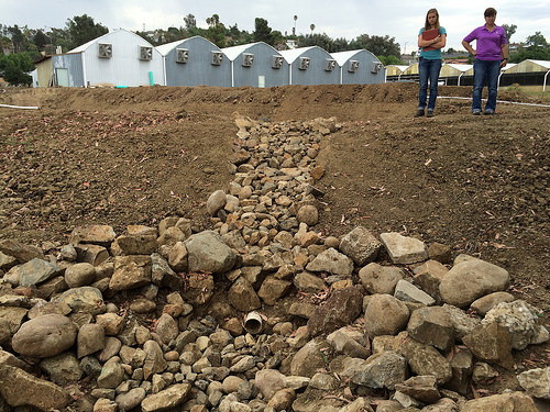 Commander Everest (right) and a Conservation District employee (left) inspect a recently installed underground outlet. NRCS photo.