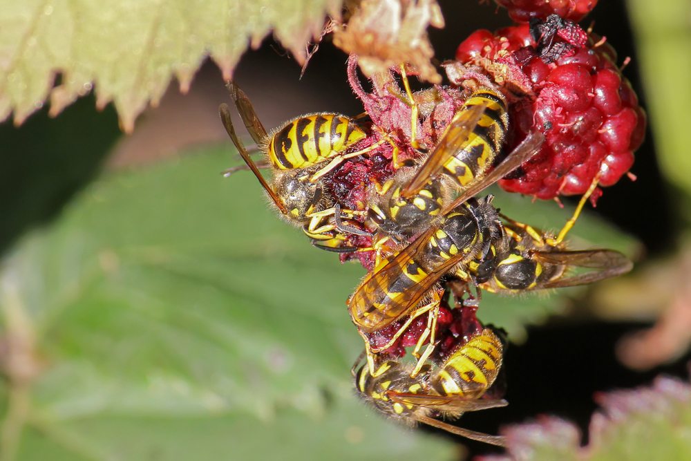 - Group of yellow jacket wasps eating raspberry fruit during summer